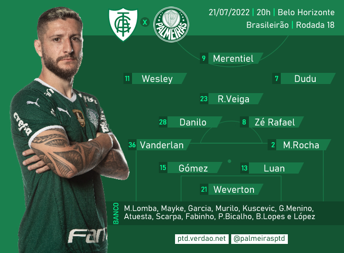 Palmeiras: Weverton; Marcos Rocha, Luan, Gómez e Vanderlan; Zé Rafael, Danilo e Raphael Veiga; Dudu, Wesley e Merentiel