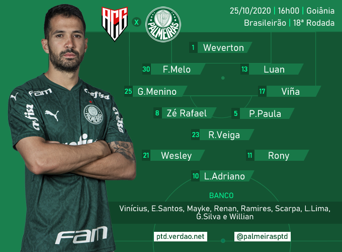 Palmeiras: Weverton; Gabriel Menino, Felipe Melo, Luan e Viña; Patrick de Paula, Zé Rafael e Raphael Veiga; Rony, Wesley e Luiz Adriano