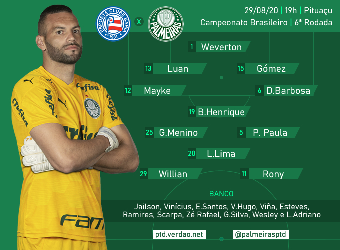 Palmeiras: Weverton; Mayke, Luan, Gustavo Gómez e Diogo Barbosa; Patrick de Paula, Gabriel Menino, Bruno Henrique e Lucas Lima; Rony e Willian