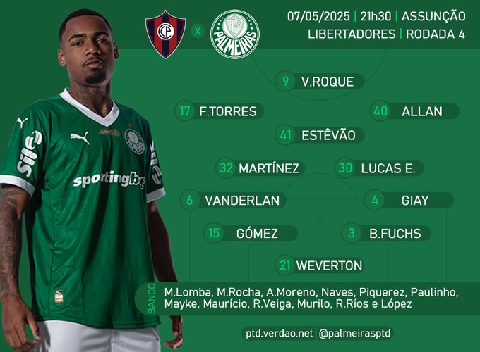 Palmeiras: Weverton; Giay, Bruno Fuchs, Gustavo Gómez e Vanderlan; Martínez, Lucas Evangelista e Estêvão; Allan, Facundo Torres e Vitor Roque