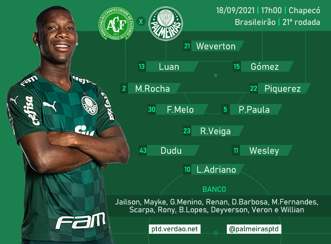 Palmeiras: Weverton, Marcos Rocha, Luan, Gómez e Piquerez; Felipe Melo, Patrick de Paula e Raphael Veiga; Dudu, Wesley e Luiz Adriano