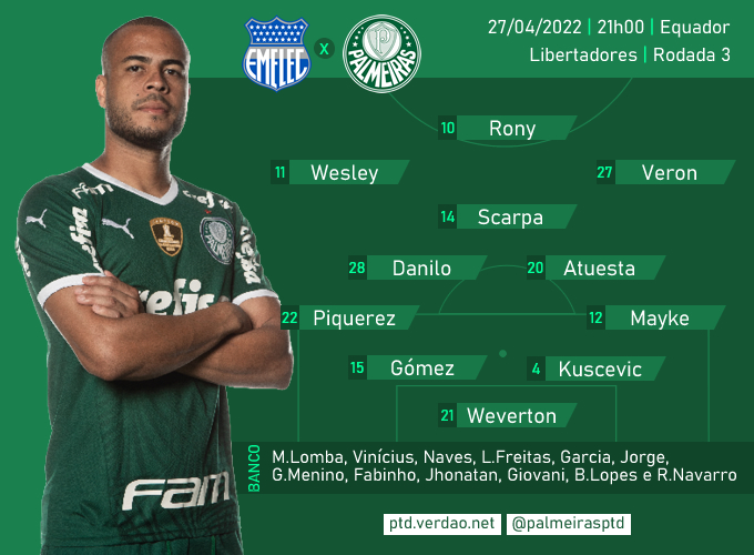 Palmeiras: Weverton; Mayke, Kuscevic, Gómez e Piquerez; Danilo, Atuesta e Scarpa; Veron, Wesley e Rony