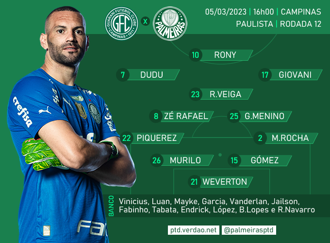 Palmeiras: Weverton; Marcos Rocha, Gómez, Murilo e Piquerez; Gabriel Menino, Zé Rafael e Raphael Veiga; Giovani, Dudu e Rony