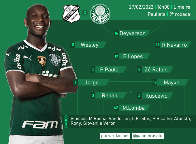 Palmeiras: Marcelo Lomba; Mayke, Kuscevic, Renan e Jorge; Zé Rafael, P.Paula e Wesley; Breno Lopes, Rafael Navarro e Deyverson