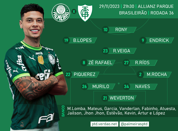 Palmeiras: Weverton; Marcos Rocha, Naves e Murilo e Piquerez; Zé Rafael, Richard Ríos e Raphael Veiga; Endrick, Breno Lopes e Rony