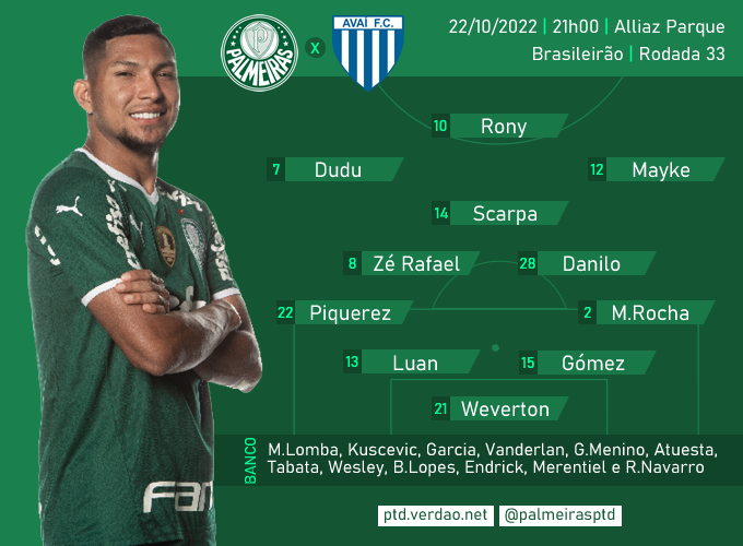 Palmeiras: Weverton; Marcos Rocha, Luan, Gómez e Piquerez; Danilo, Zé Rafael e Scarpa; Mayke, Dudu e Rony