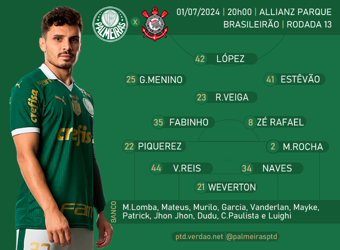 Palmeiras: Weverton; Marcos Rocha, Naves, Vitor Reis e Piquerez; Fabinho, Zé Rafael e Raphael Veiga; Estêvão, Gabriel Menino e López