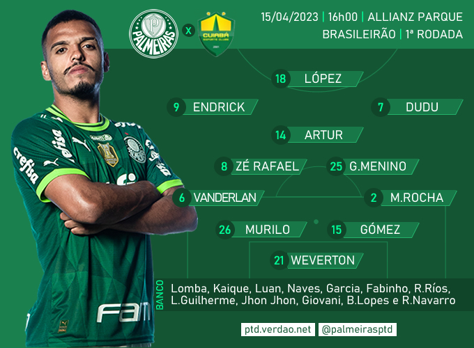 Palmeiras: Weverton; Marcos Rocha, Gómez, Murilo e Vanderlan; Zé Rafael, Gabriel Menino e Artur; Dudu, Endirck e López