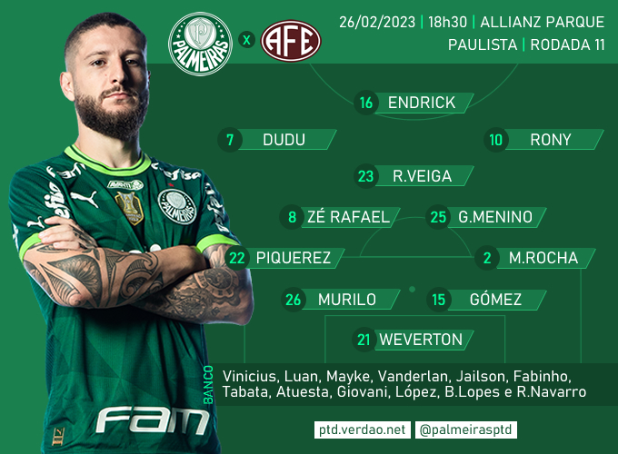 Palmeiras: Weverton; Marcos Rocha, Gómez, Murilo e Piquerez; Zé Rafael, Gabriel Menino e Raphael Veiga; Rony, Dudu e Endrick