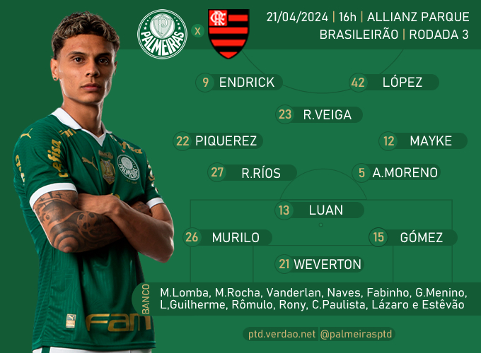 Palmeiras: Weverton; Gómez, Luan e Murilo; Mayke, Aníbal Moreno, Richard Ríos, Raphael Veiga e Piquerez; Endrick e López