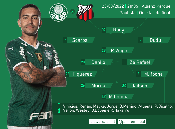 Palmeiras: Marcelo Lomba; Marcos Rocha, Jailson, Murilo e Piquerez; Zé Rafael, Danilo e Raphael Veiga; Scarpa, Dudu e Rony