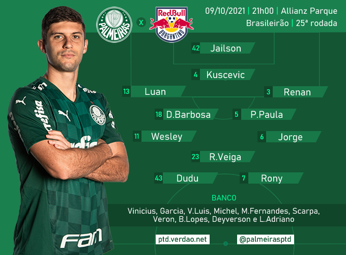 Palmeiras: Jailson; Luan, Kuscevic e Renan; Wesley, Danilo Barbosa, Patrick de Paula, Raphael Veiga e Jorge; Dudu e Rony