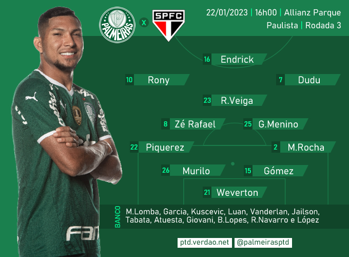 Palmeiras: Weverton; Marcos Rocha, Gómez, Murilo e Piquerez; Gabriel Menino, Zé Rafael e Raphael Veiga; Dudu, Rony e Endrick
