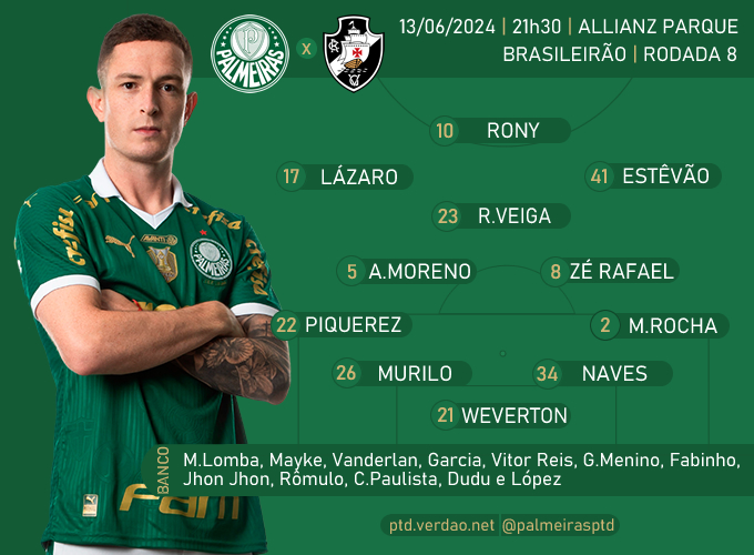 Palmeiras: Weverton; Marcos Rocha, Naves, Murilo e Piquerez; Aníbal Moreno, Zé Rafael e Raphael Veiga; Estêvão, Lázaro e Rony