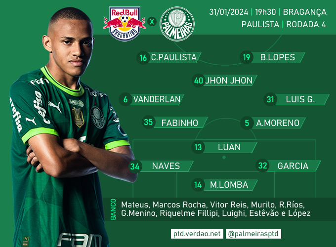 Palmeiras: Marcelo Lomba; Garcia, Luan e Naves; Luis Guilherme, Aníbal Moreno, Fabinho, Jhon Jhon e Vanderlan; Caio Paulista e Breno Lopes