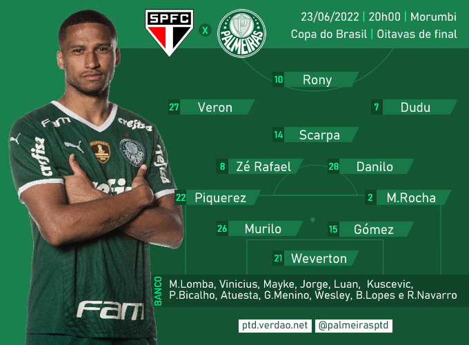 Palmeiras: Weverton; Marcos Rocha, Gómez, Murilo e Piquerez; Zé Rafael, Danilo e Scarpa; Dudu, Veron e Rony