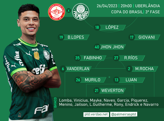 Palmeiras: Weverton; Marcos Rocha, Murilo, Luan e Vanderlan; Richard Rios, Fabinho e Jhon Jhon; Giovani, Breno Lopes e López