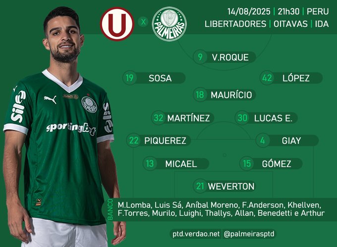 Palmeiras: Weverton; Giay, Gómez, Micael e Piquerez; Martínez, Lucas Evangelista e Maurício; López, Sosa e Vitor Roque